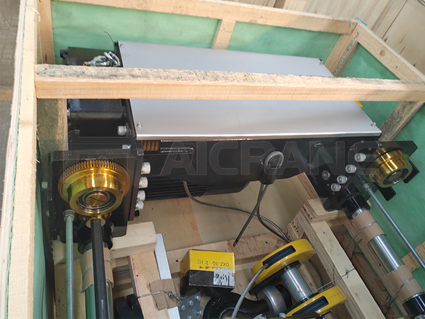 The following is the European-style electric hoist packed in a wooden box, and will be shipped to Nigeria soon. The European-style electric hoist is installed on the AQ-HD 10-ton overhead crane for lifting heavy objects in the customer’s workshop.